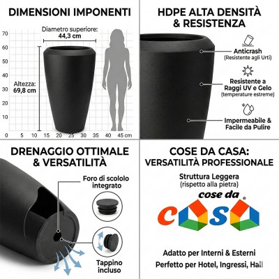 Cose da Casa vi propone soluzioni intelligenti e di stile, pensate per chi non vuole rinunciare alla bellezza nella propria quotidianità.Elegante set composto da 2 pezzi di vasi cilindrici realizzati in HDPE NERO con finitura effetto grafite. Entrambi i vasi presentano un diametro superiore di 44,3 cm e un'altezza di 69,8 cm, offrendo una soluzione simmetrica ideale per ingressi e terrazze. La struttura in poliresina ad alta densità garantisce una durata eccezionale e una grande facilità di posizionamento.