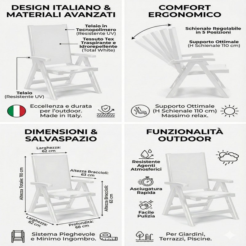 Il punto di forza di questo modello è lo schienale ergonomico, regolabile in ben 5 posizioni diverse, che permette di passare rapidamente dalla modalità lettura a quella relax totale. La seduta e lo schienale sono realizzati in tessuto tex bianco: una fibra tecnologica traspirante che dona luminosità all'ambiente, previene l'accumulo di calore sulla pelle e risulta completamente idrorepellente, facilitando un'asciugatura rapida dopo piogge o esposizione all'umidità.
