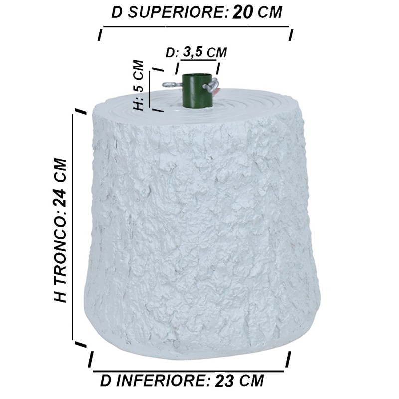 Realizzato in vetroresina con materiali di alta qualità, il tronco finto presenta dettagli che ne replicano l'aspetto naturale, garantendo una soluzione esteticamente gradevole per il vostro albero. La parte superiore è dotata di un cilindro di 3,5 cm, completo di tre viti, che assicura un'installazione stabile e sicura del vostro albero.