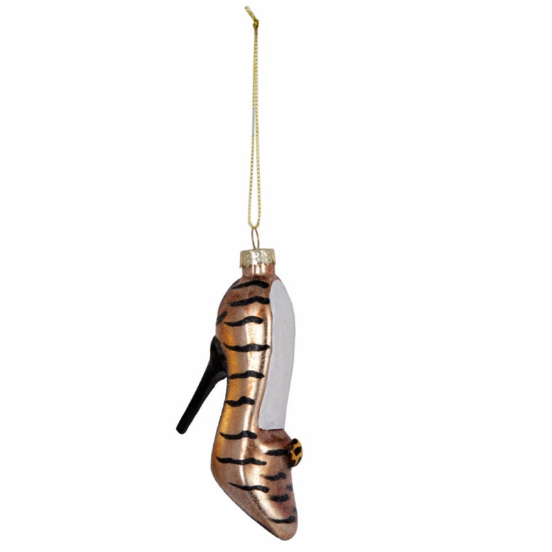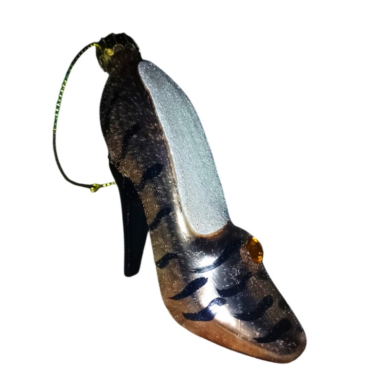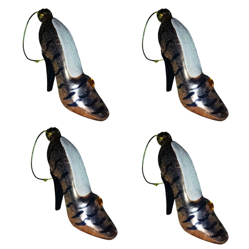 COSEDACASA Vi propone un set di 4 addobbi natalizi in vetro soffiato dalla forma originale ed elegante di scarpe con tacco a punta. Queste decorazioni si distinguono per la loro finitura ricercata e l'effetto visivo unico dato dalla colorazione bronzo chiaro con raffinate strisce nere.
