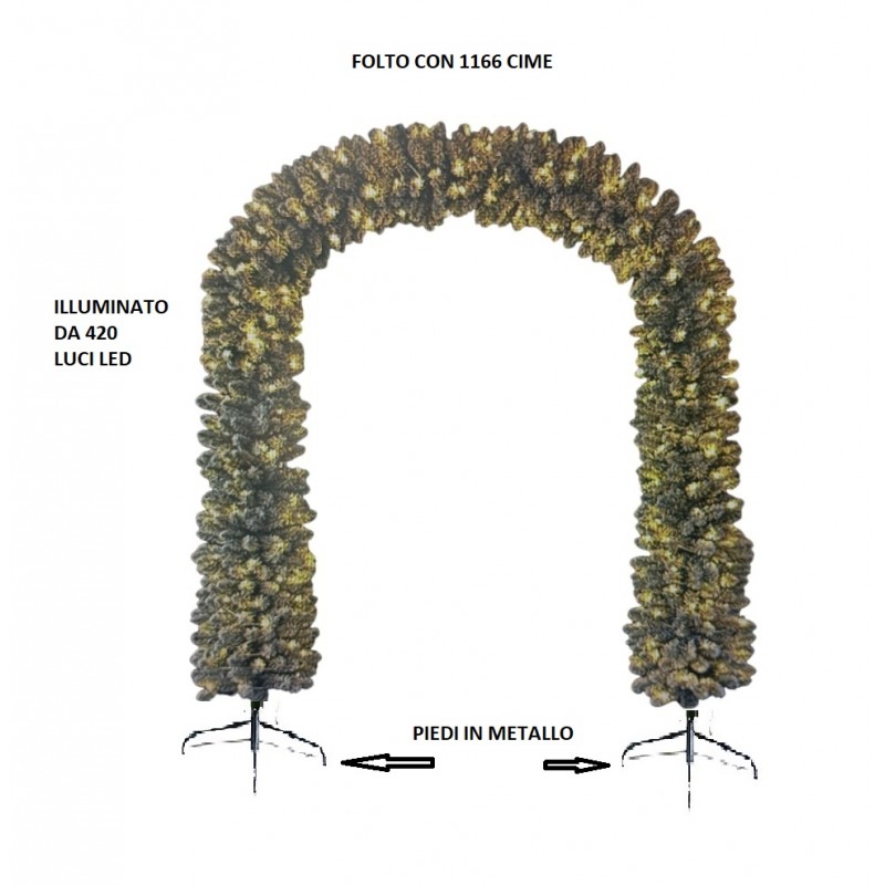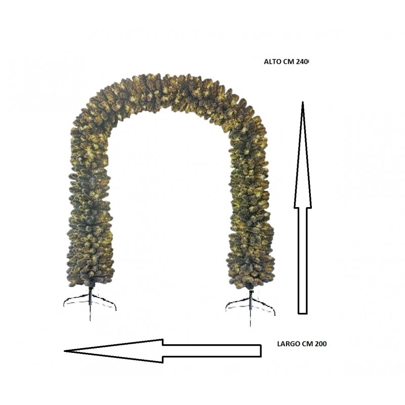 L’arco è alto 240 cm e largo 200 cm, realizzato con ben 1166 cime folte effetto abete naturale, arricchite da una nevicata artificiale bianca distribuita con cura per creare un effetto invernale elegante e realistico.