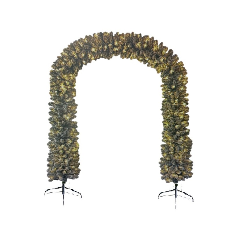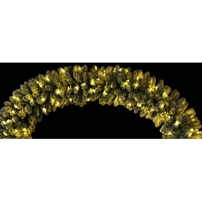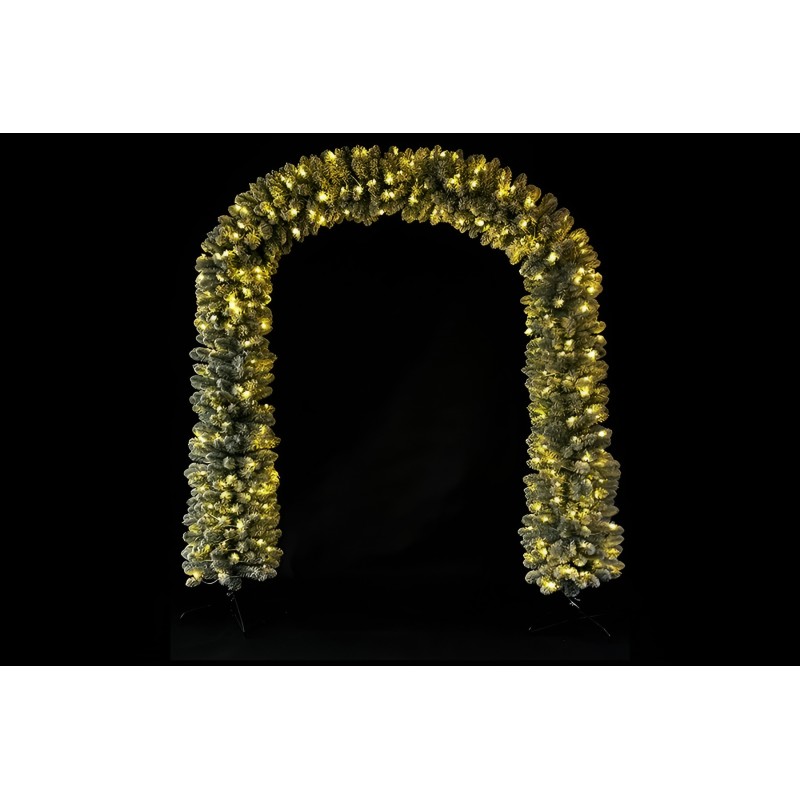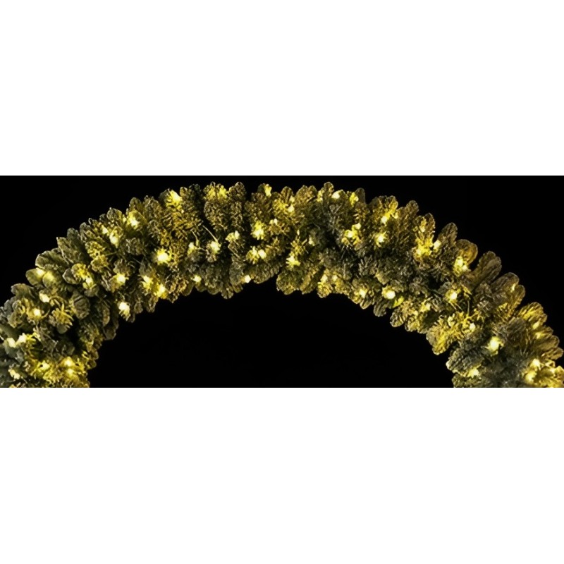 Arco decorativo verde innevato, ideale per ambienti natalizi eleganti. Realizzato con 1166 cime folte effetto realistico, rivestite con neve artificiale bianca per un impatto scenico unico. Illuminato da 420 luci LED a luce calda, perfette per creare un’atmosfera accogliente e luminosa.