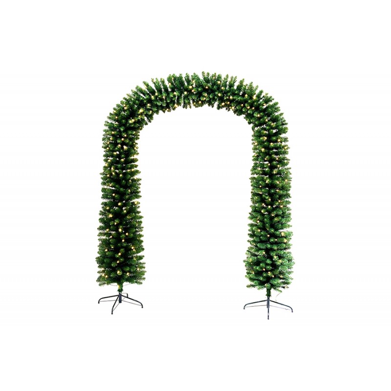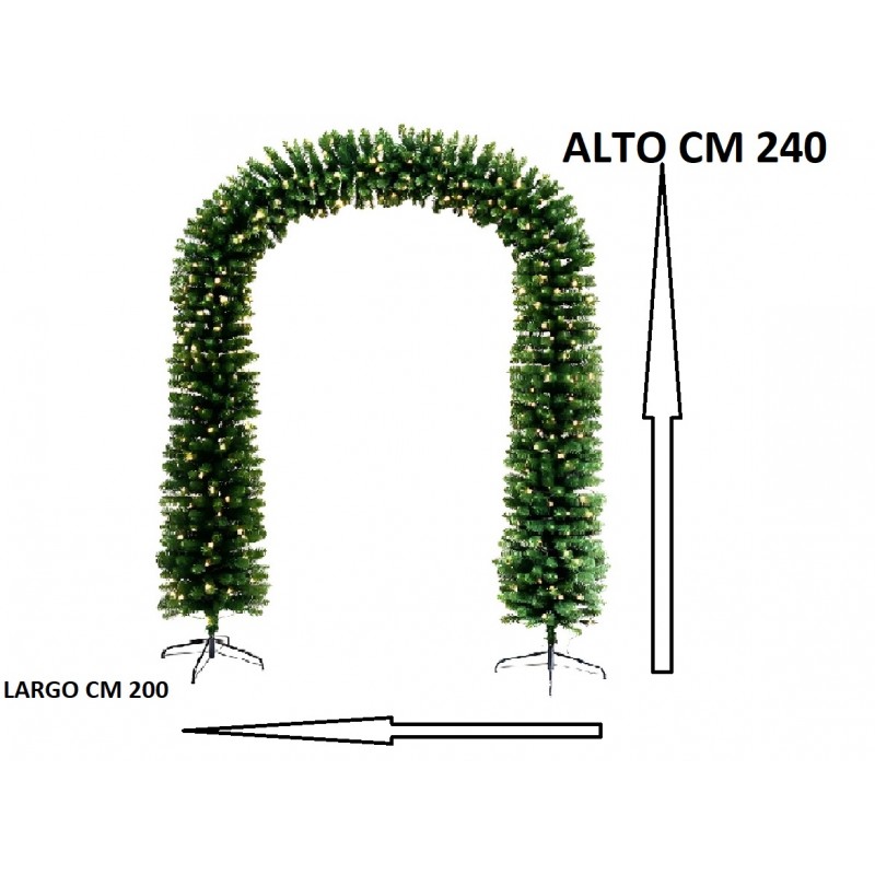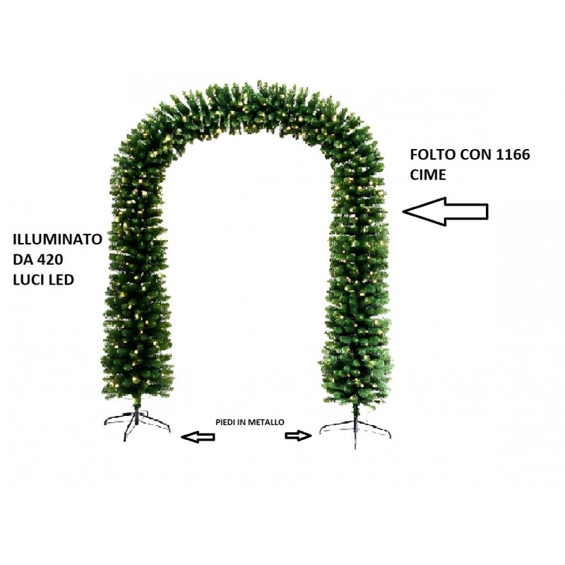 Arco decorativo verde con 1166 cime folte e realistiche, illuminato da 420 luci LED a luce calda. Altezza 240 cm, larghezza 200 cm, realizzato in PVC di qualità con base in metallo robusto e stabile. Perfetto come ingresso scenografico per negozi, showroom, eventi, fiere, attività commerciali o spazi domestici. Uso interno/esterno, semplice da montare.