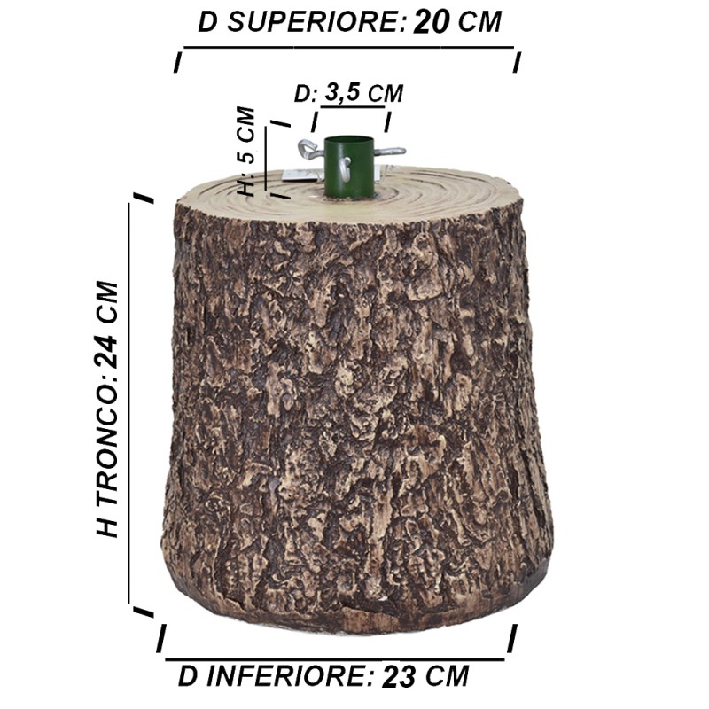 Piede per albero di Natale a forma di tronco realistico, altezza 24 cm, diametro BASE 23 cm.
