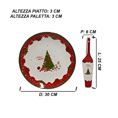 Il piatto ha un diametro di 30 cm e un’altezza di 3 cm, perfetto per accogliere anche dolci di grandi dimensioni. È realizzato in ceramica robusta e smaltata, decorata con cura con motivi natalizi classici: albero di natalein tonalità rosso, verde e dettagli dorati. Il set include anche una paletta in ceramica abbinata, con lo stesso decoro, pensata per un servizio elegante e coordinato.