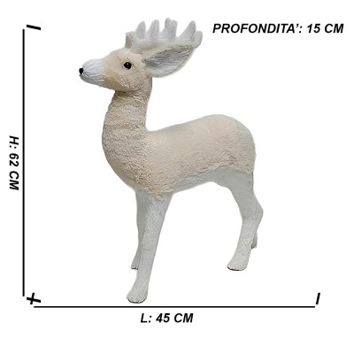 COSEDACASA Vi propone una straordinaria figura di renna cerbiatto ideale per arricchire gli ambienti durante le festività natalizie. Questa decorazione è alta 62 larga cm 45 profondo cm 15 cm , realizzata in polistirolo e rifinita con una morbida pelliccia bianca e beige.