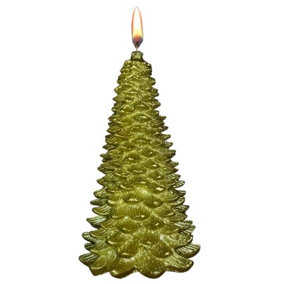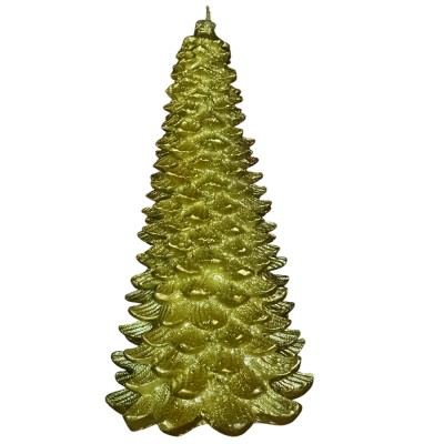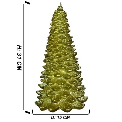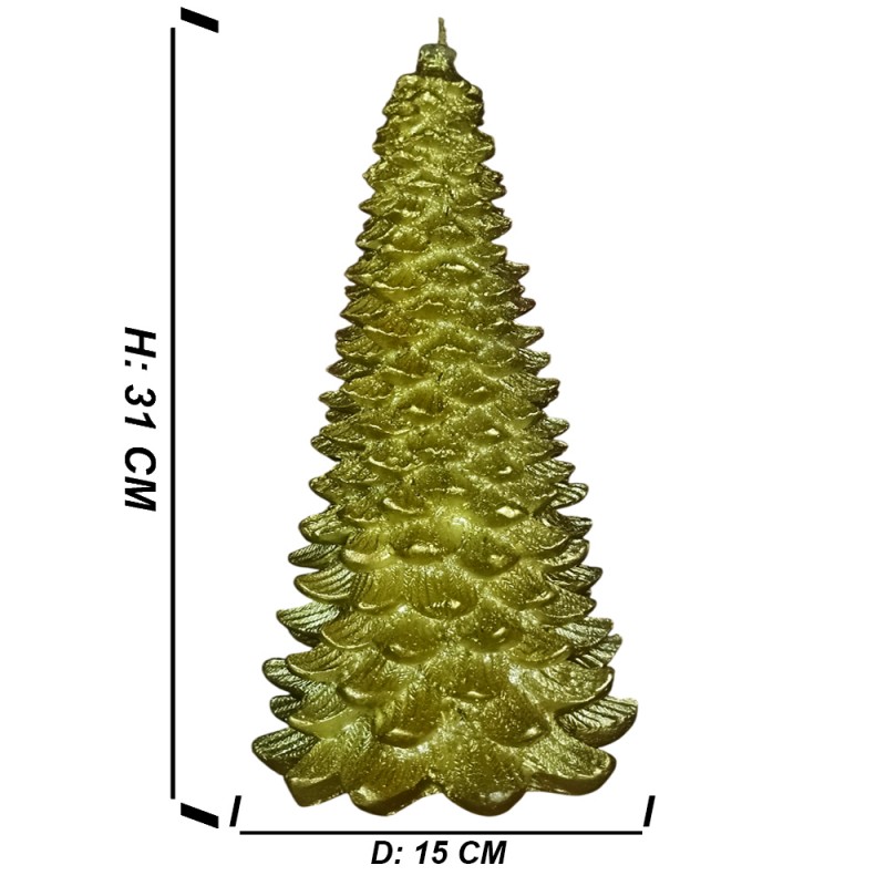 Candela decorativa natalizia a forma di albero di Natale, realizzata interamente in cera di alta qualità, con una finitura color oro metallizzato che cattura la luce e impreziosisce ogni ambiente. Un articolo elegante e scenografico, perfetto come centrotavola di Natale o per decorare salotti, ingressi, tavole imbandite, negozi o vetrine durante il periodo natalizio.