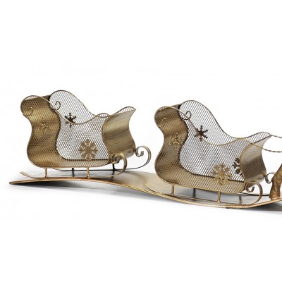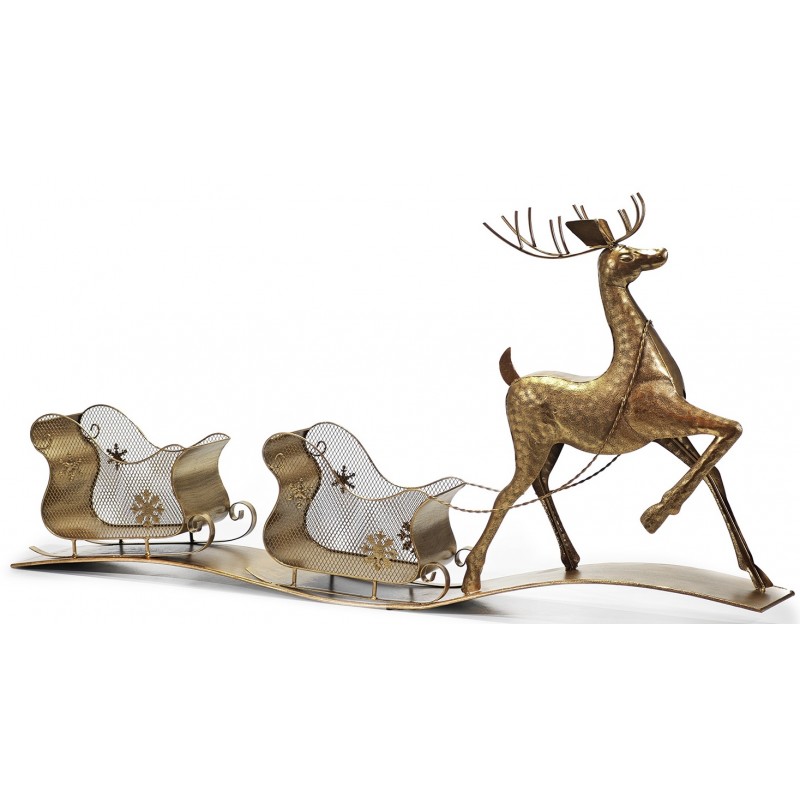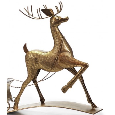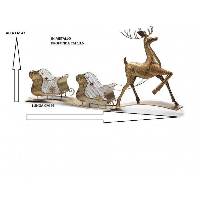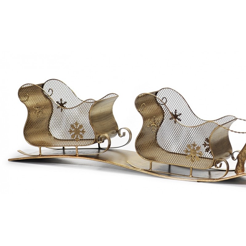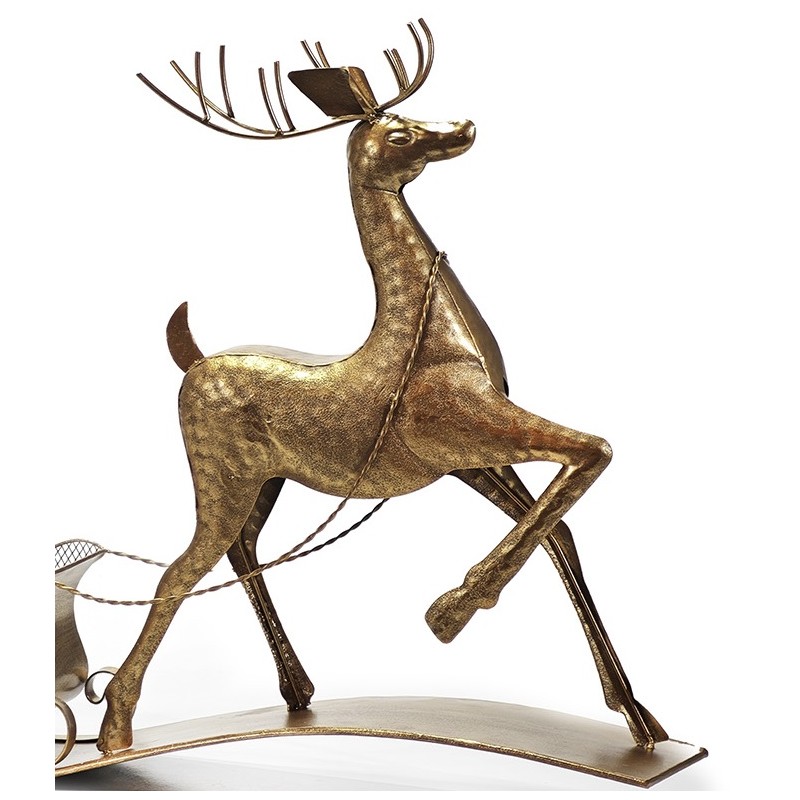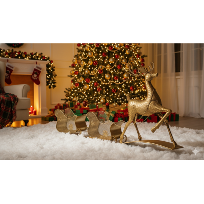 COSEDACASA Vi propone uno splendido complemento d’arredo natalizio: una maestosa renna che traina due slitte realizzate in metallo martellato color oro, dallo stile elegante e raffinato, perfetta per arricchire la vostra casa o il vostro ambiente con un tocco di luce e magia durante le festività.