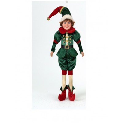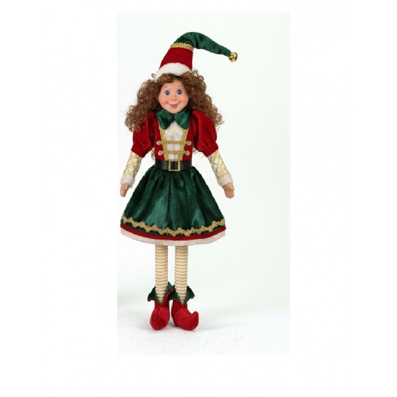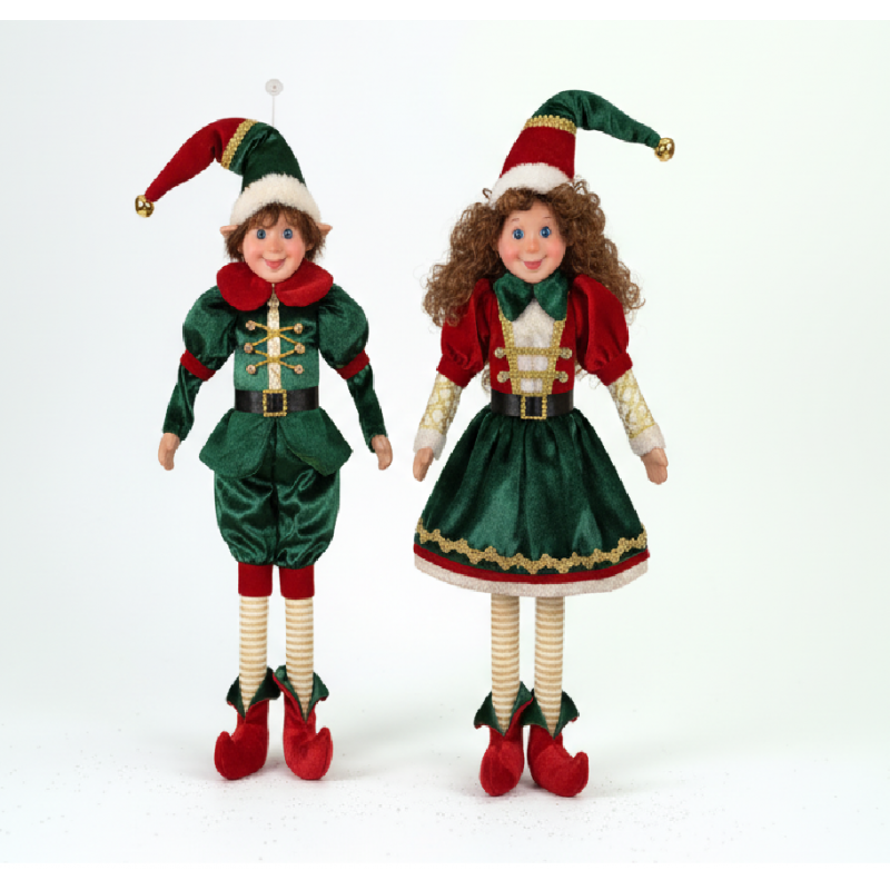 Realizzati con materiali di qualità, questi elfi sono caratterizzati da abiti in velluto verde con dettagli rossi, scarpe a punta, calze a righe e cappello natalizio con pompon dorato.