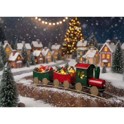 La struttura in metallo dipinto a mano, con finiture dorate e dettagli curati, conferisce al trenino un aspetto elegante e luminoso, capace di trasmettere calore e atmosfera natalizia.