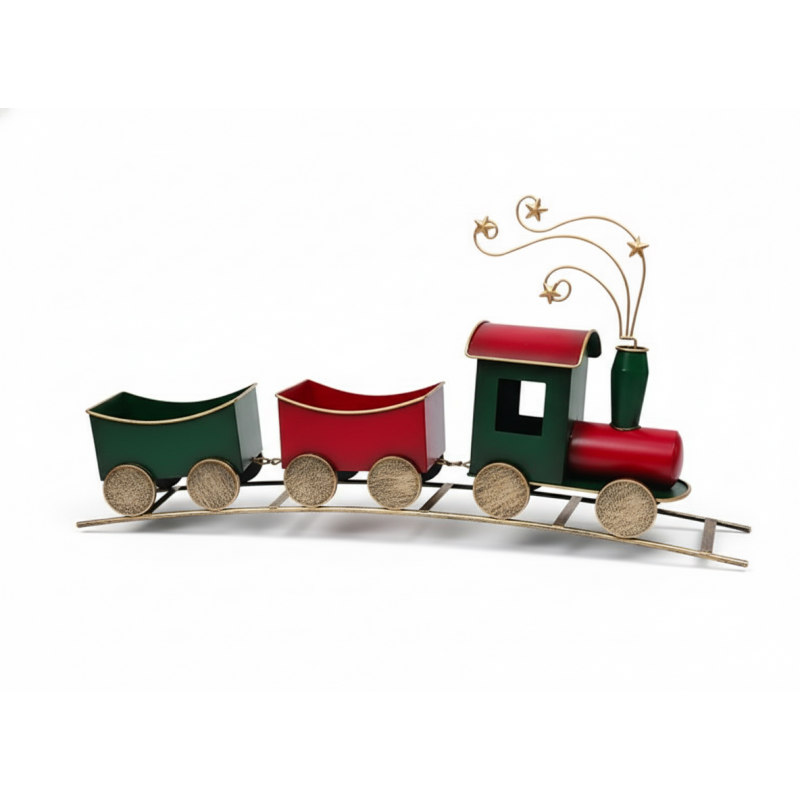 Trenino natalizio decorativo in metallo, colori rosso e verde con finiture dorate