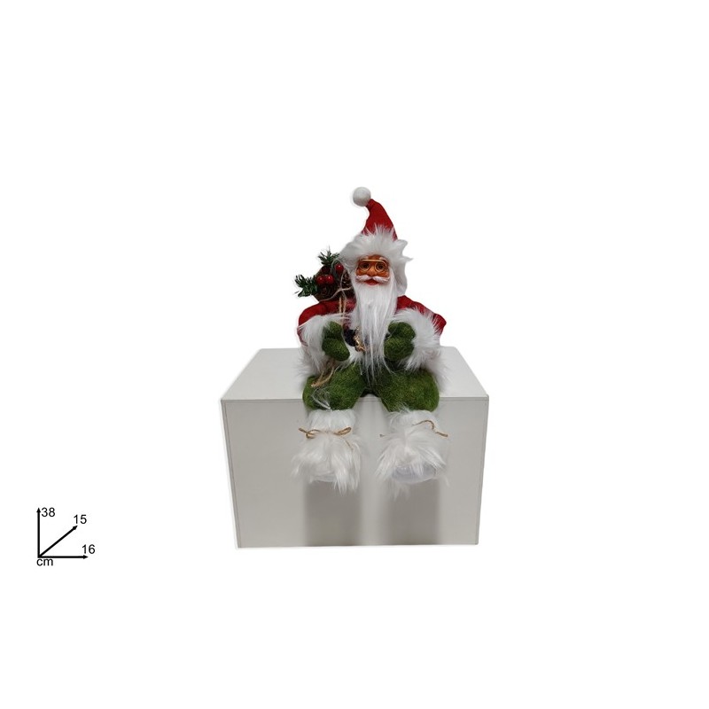 Con i suoi 38 cm di altezza, questo Babbo Natale è perfetto da sistemare su mensole, tavoli, mobili, camini o banchi. È realizzato in tessuto rosso e verde, con una barba bianca lunga e soffice, un cappello tradizionale con pon pon, occhiali e un sacco colmo di regali per i bambini.