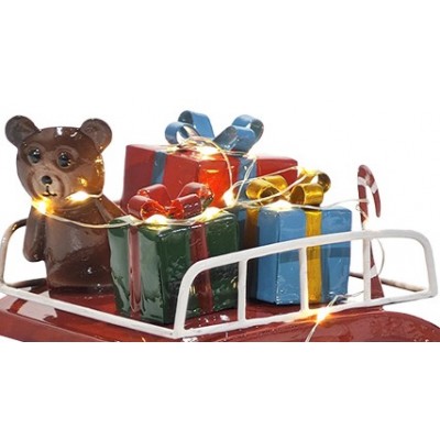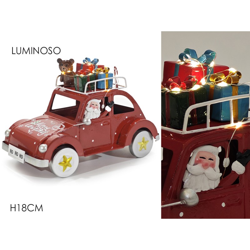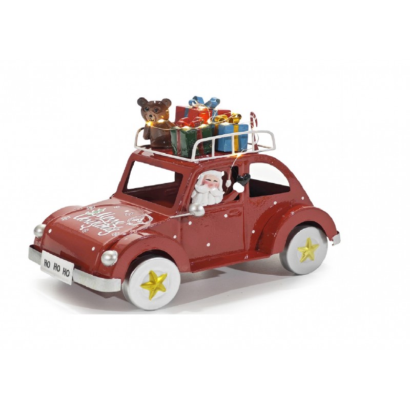 COSEDACASA Vi propone una splendida macchina retrò natalizia in metallo/latta, decorata con Babbo Natale alla guida e un portapacchi carico di doni e regali per i bambini.