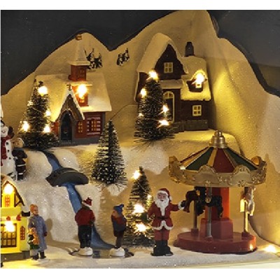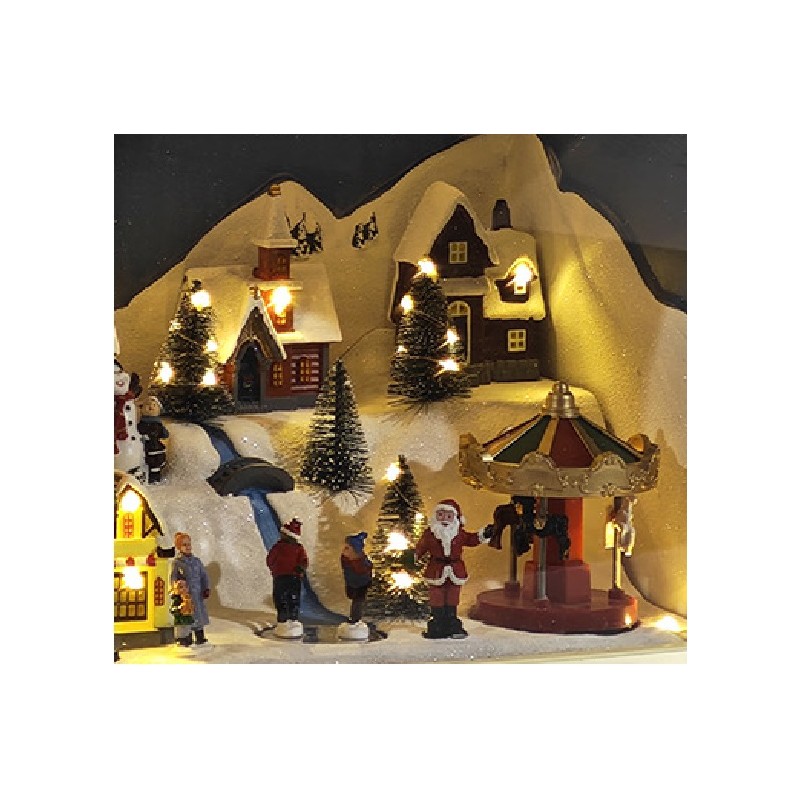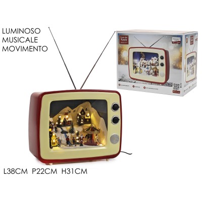 All’interno di un televisore antico con antenne, prende vita un villaggio innevato ricco di dettagli: casette illuminate, personaggi in movimento, giostre rotanti e paesaggi incantevoli, che si animano con dolci melodie natalizie.