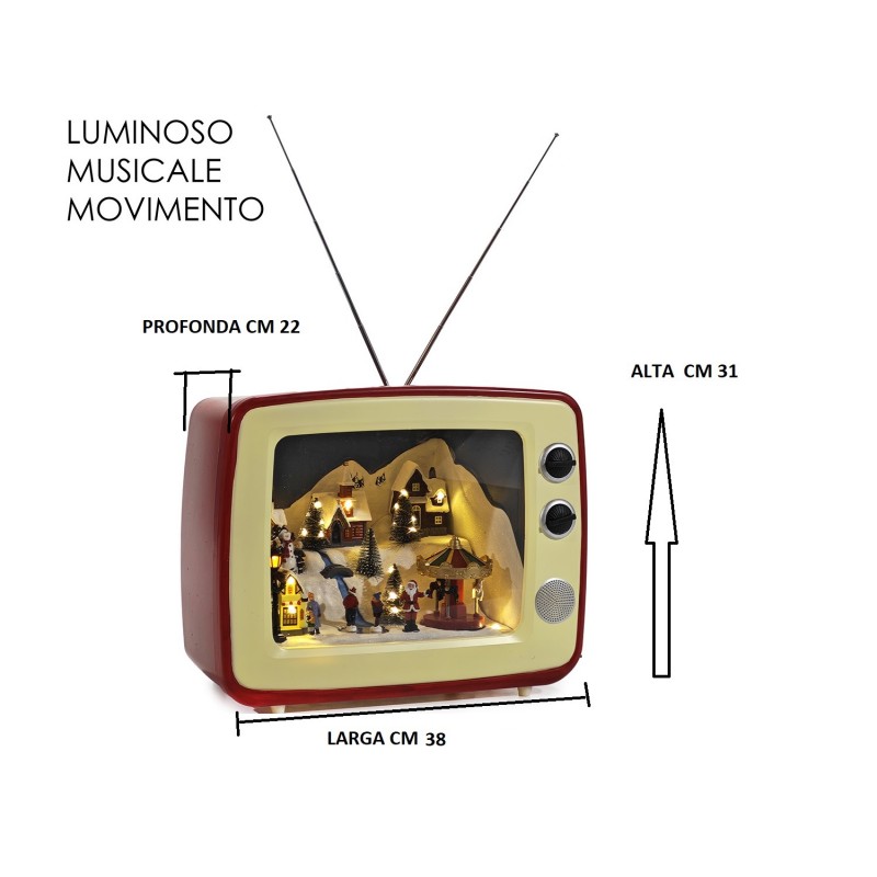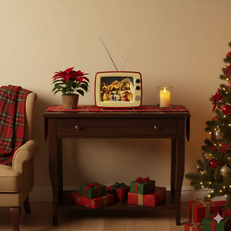 COSEDACASA Vi propone un incantevole Scenario Natalizio in TV Vintage con luci, movimento e musica, una decorazione dallo stile retrò che cattura tutta la magia del Natale.