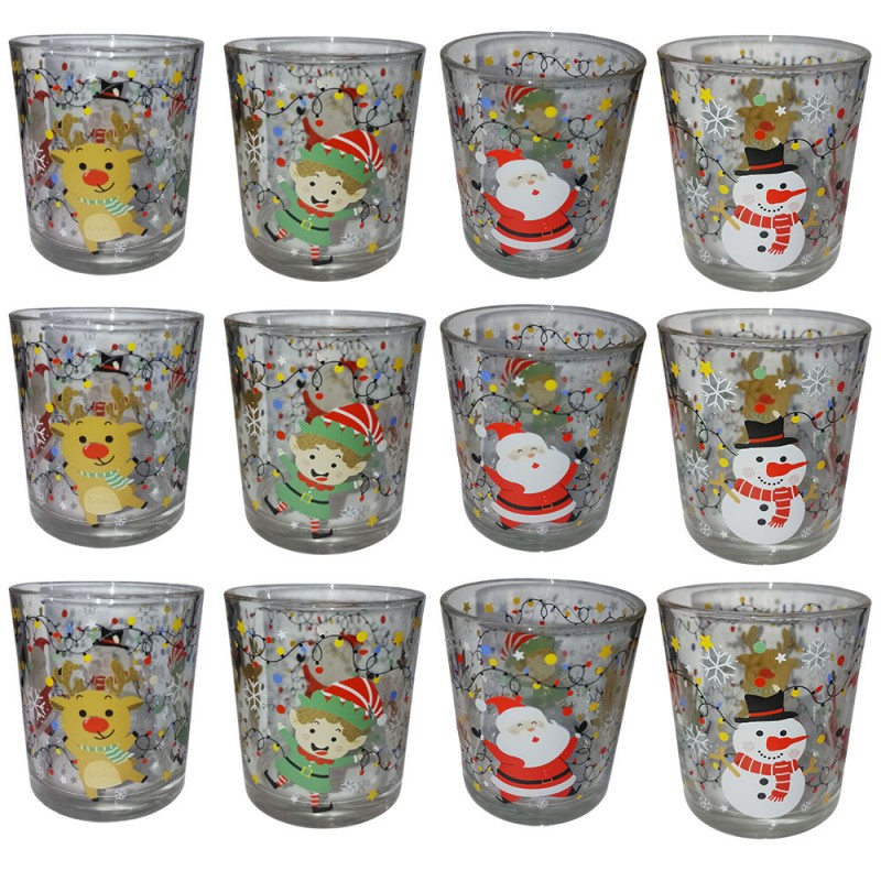 Set di 12 bicchieri in vetro da 25 cl con decorazioni natalizie assortite: gnomi, elfi, Babbo Natale, renna "Merry Christmas". Perfetti per le festività e per decorare la tua tavola.