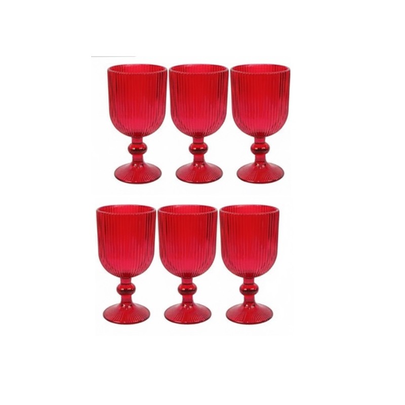 Set di 6 bicchieri rossi a calice da acqua da 340 ml, perfetti per rendere la tua tavola natalizia elegante e suggestiva. Con un design raffinato, questi bicchieri sono realizzati in vetro colorato rosso effetto cristallo, donando uno stile prezioso e brillante, ideale per cene, eventi speciali, matrimoni o feste natalizie.