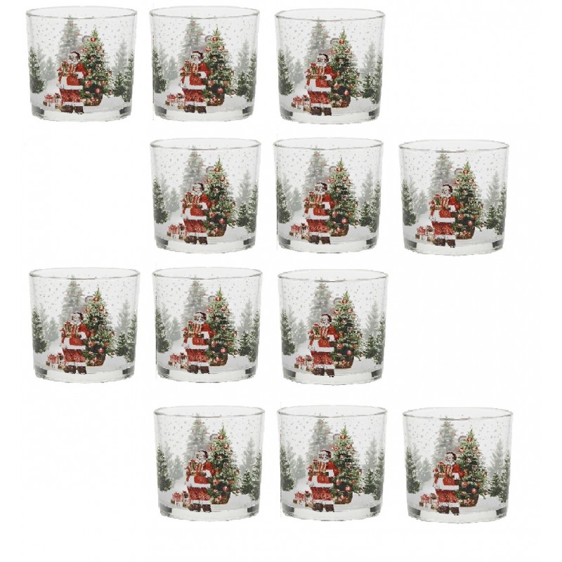Set composto da 12 bicchieri in vetro trasparente da 25 cl,D 8 H 7.5, ideali per acqua, bibite o cocktail. Ogni bicchiere presenta più decorazioni natalizie lungo tutta la superficie: simpatico Babbo Natale, e motivi festivi che si alternano sul vetro per un effetto decorativo a 360 gradi. Il design è pensato per creare una tavola calda, accogliente e festosa.