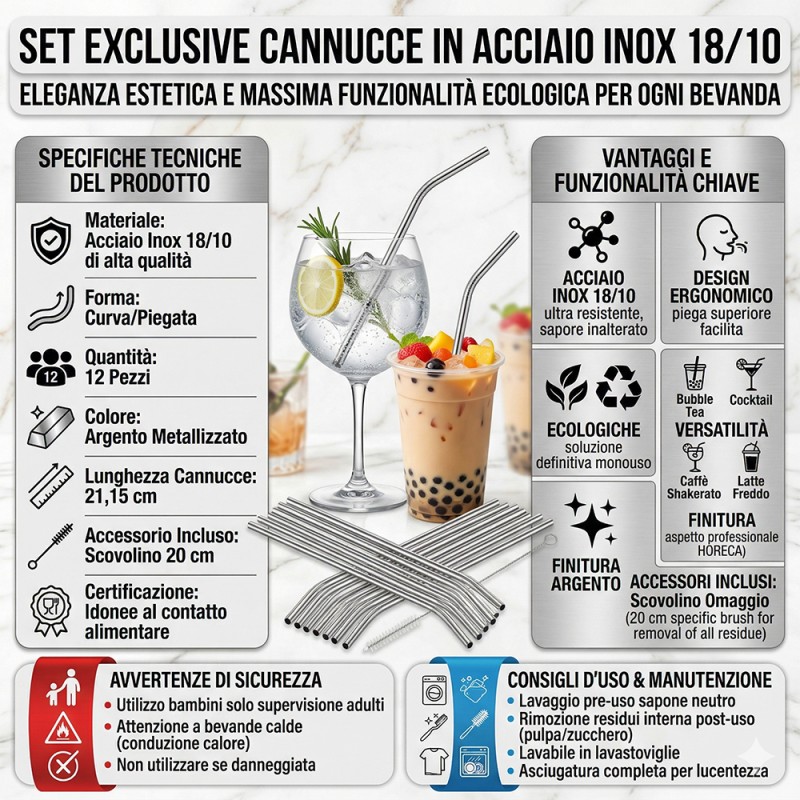 L'impiego dell'acciaio 18/10 garantisce una resistenza superiore alla corrosione e assicura che il sapore delle vostre bevande rimanga inalterato, a differenza delle alternative in plastica o carta. La finitura argento brillante conferisce un aspetto professionale e moderno, rendendo queste cannucce un accessorio indispensabile per chi desidera eliminare i prodotti usa e getta senza rinunciare allo stile.