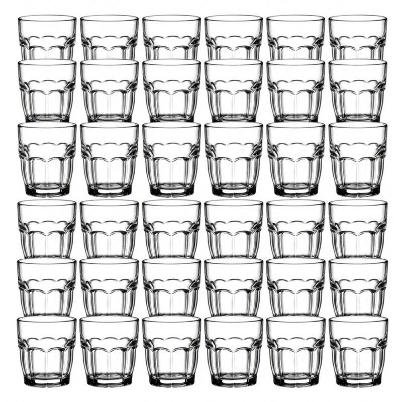 Set da 36 bicchieri Bormioli Rocco Rock Bar da 20 cl, in vetro temperato di alta qualità. Impilabili, resistenti e ideali per uso professionale e domestico.
