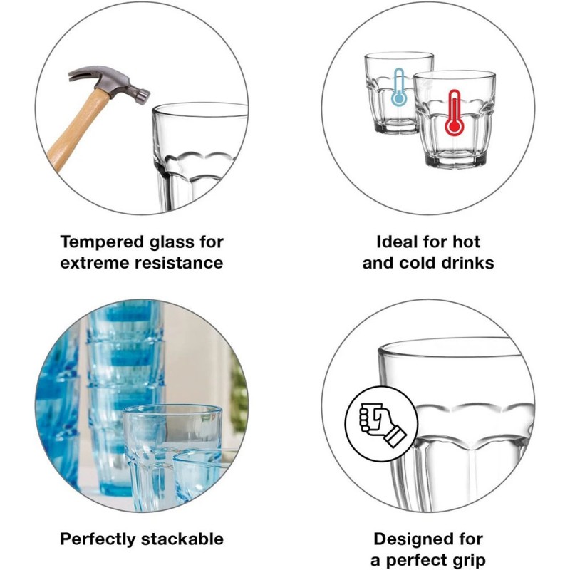 Set da 12 Bicchieri lavabili in lavastoviglie, perfettamente impilabili, salva spazio, temperati per garantire la massima praticità e resistenza agli urti e agli shock termici: