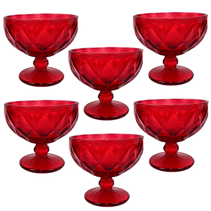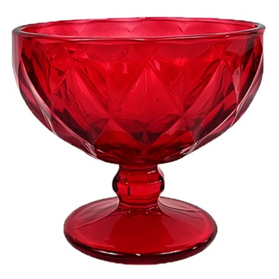 Realizzati in vetro rosso lavorato con effetto diamante, questi bicchieri hanno una capienza di 340 ml, altezza 16,5 cm e diametro di 8,5 cm. Il calice è dotato di un piede stabile, che conferisce classe e comfort nell’utilizzo quotidiano o in occasioni speciali.