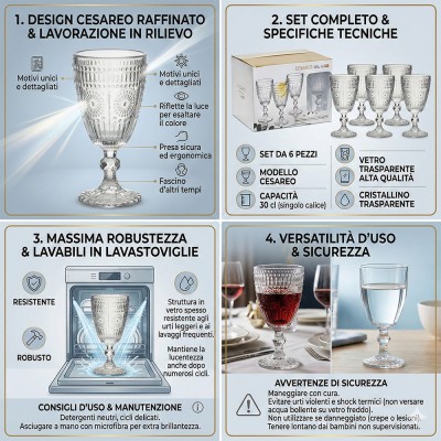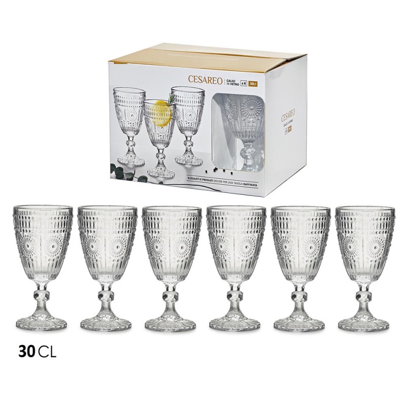 Questo esclusivo set è composto da 6 calici in vetro trasparente di alta qualità, caratterizzati dalla prestigiosa lavorazione Cesareo che dona un tocco retrò e raffinato. Ogni pezzo ha una capacità di 30cl, ideale per servire con distinzione acqua e vino in ogni occasione formale o quotidiana. Il vetro spesso garantisce resistenza e una brillantezza duratura nel tempo.