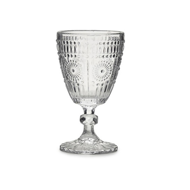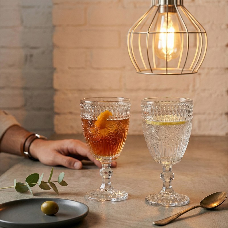 Il corpo del calice è decorato con motivi geometrici e floreali stilizzati che offrono anche una presa sicura ed ergonomica. Lo stelo solido e la base bilanciata rendono questi calici perfetti non solo per la tavola domestica, ma anche per l'uso intensivo in ambienti professionali come bar e ristoranti che cercano un'immagine ricercata.