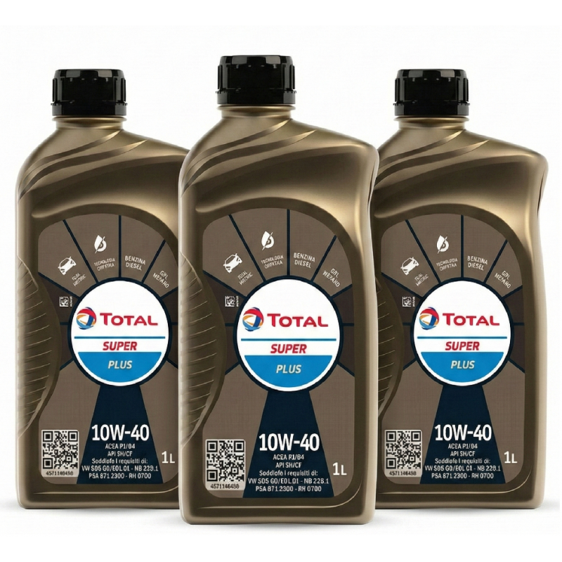 Specifiche tecniche riassuntive del kit:Marca: TotalProdotto: Super PlusComposizione Kit: 3 flaconi da 1 LitroQuantità Totale: 3 LitriViscosità: 10W-40Tecnologia: SinteticaApplicazioni: Benzina, Diesel, GPL, Metano, Rabbocchi