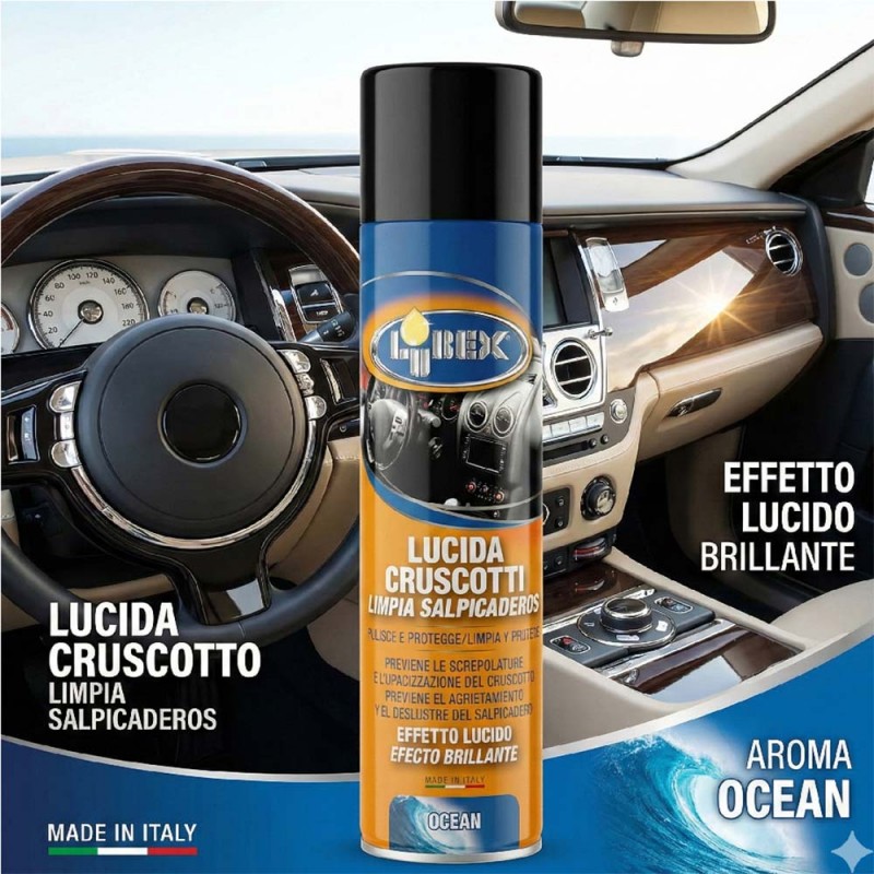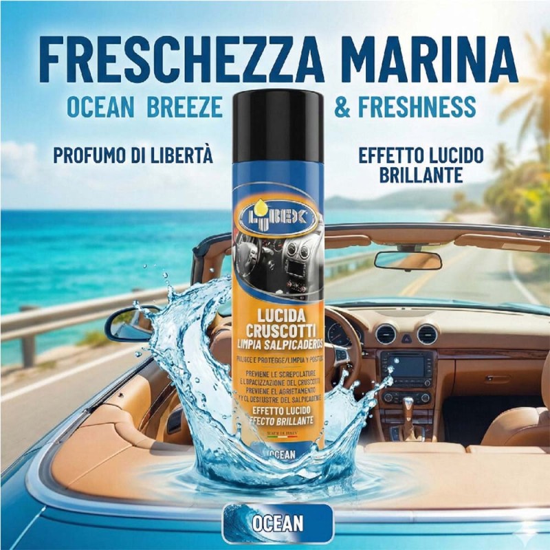cosedacasa vi propone Lucida Cruscotti Auto spray 600 ml by LUBE-X OCEAN , ideale per pulire, lucidare e proteggere le superfici interne del veicolo. Effetto brillante, azione antistatica e profumazione gradevole per un abitacolo sempre curato.