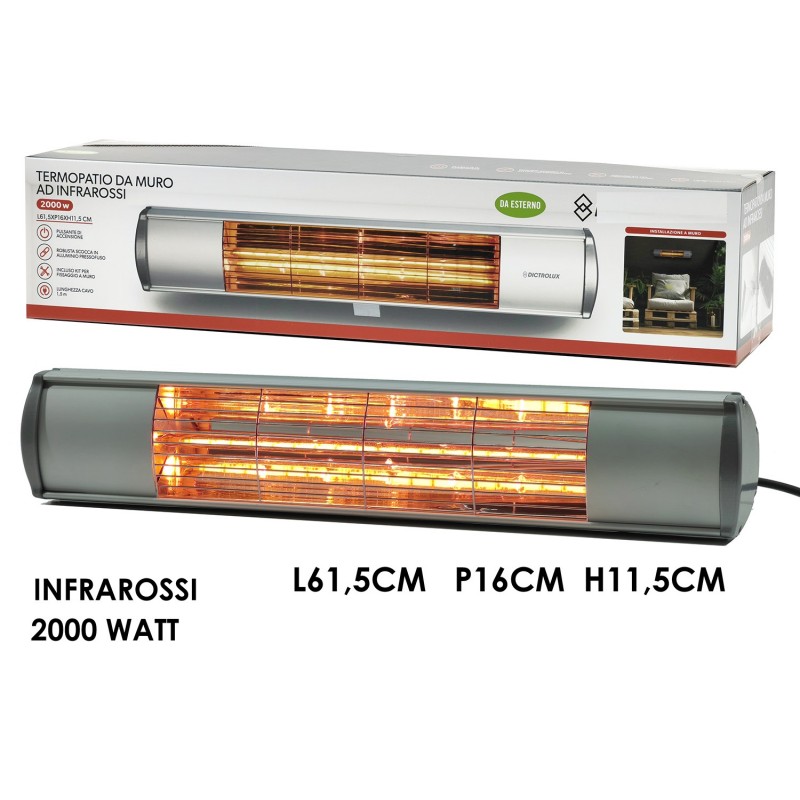 Il termopatio è dotato di kit per installazione a muro, cavo di alimentazione da 1,5 metri e sistema di protezione contro il surriscaldamento.