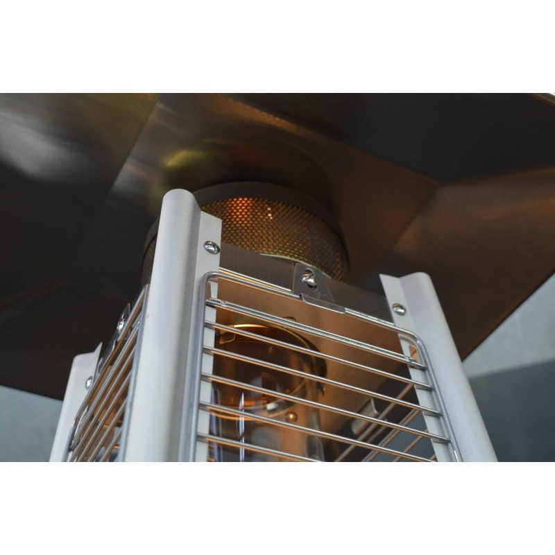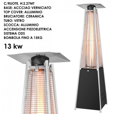 Con una potenza di 13 kW, questo riscaldatore garantisce una copertura termica ottimale. La sua notevole altezza di $2.27 \text{ MT}$ e il riflettore superiore in Alluminio permettono una diffusione del calore ampia e uniforme, creando un'area confortevole intorno.