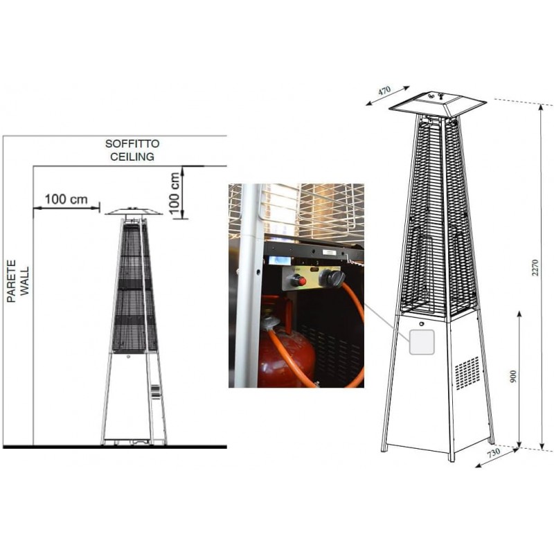 DESIGN E ALTEZZA: Struttura piramidale elegante con altezza di 2.27 Metri (H:2.27MT), fornita di tubo centrale in Vetro per la fiamma a vista.