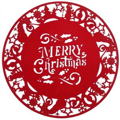 Al centro di ogni sottopiatto è intagliata la scritta "Merry Christmas", mentre lungo il bordo troviamo motivi natalizi ritagliati: pupazzo di neve, fiocchi di neve, stelle e alberi di Natale.
