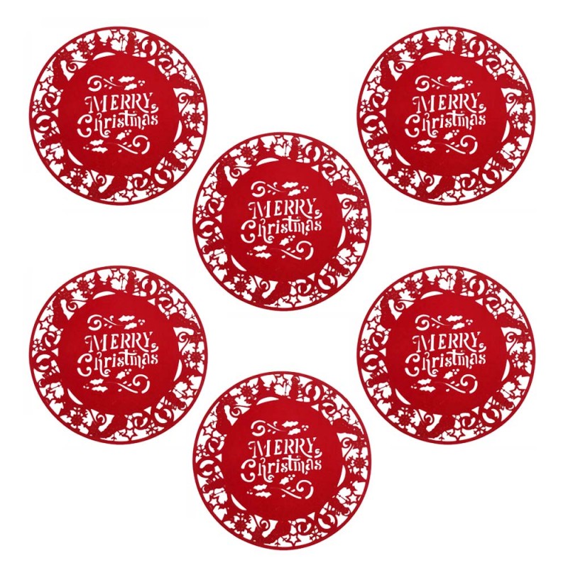 Set composto da 6 sottopiatti natalizi in feltro rosso, dal diametro di 33 cm, ideali per decorare la tavola con calore e atmosfera festiva.
