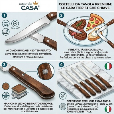 Cose da casa vi propone un'eccellenza della coltelleria italiana: un set di 12 coltelli da tavola progettati per unire prestazioni professionali e un design intramontabile. La lama è realizzata in pregiato acciaio inossidabile temperato AISI 420, caratterizzata da una lucidatura a specchio e un'affilatura a rasoio che permette tagli netti e precisi su carni e preparazioni diverse.