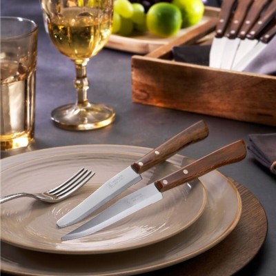 L'elemento distintivo è la punta arrotondata, che rende questi coltelli estremamente versatili: la lama mista, liscia e seghettata, è perfetta sia per tagliare con facilità una bistecca pizza o sia per spalmare formaggi morbidi o salse su fette di pane. La struttura è completata da un manico in legno resinato (Durofol), rifinito con cura artigianale per offrire il calore estetico del legno naturale con la resistenza dei materiali tecnici moderni. Il manico è fissato saldamente tramite uno speciale rivetto ad incastro, garantendo una tenuta solida e sicura nel tempo.
