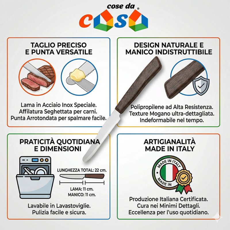 L'estetica è curata nei minimi dettagli grazie alla finitura del manico. Realizzato in polipropilene ad alta resistenza tramite iniezione diretta, il manico presenta una texture effetto legno mogano incredibilmente realistica. Questo materiale non solo dona un tocco rustico e raffinato alla mise en place, ma assicura che il prodotto rimanga indeformabile, igienico e inalterato nel tempo, superando i limiti del legno tradizionale.