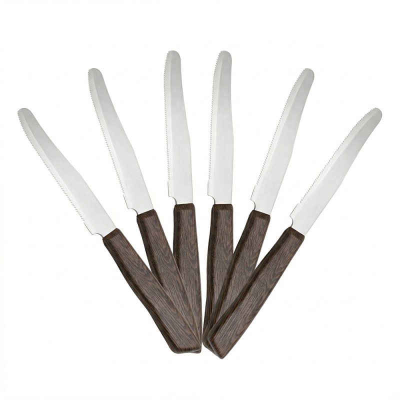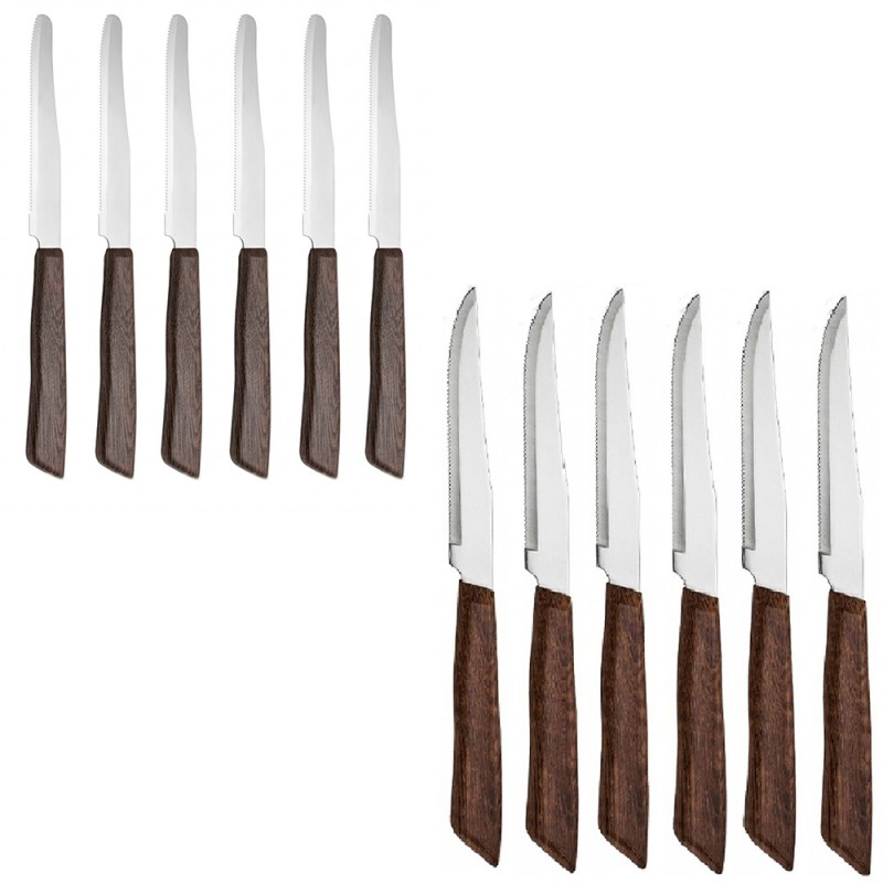 Questo set completo da 12 pezzi include 6 coltelli con punta per carne e 6 con punta arrotondata universali. Realizzati in elegante color mogano con texture effetto legno naturale, misurano 22 cm totali con lame in acciaio inox speciale da 0.8 mm. Se ordinato entro le 13:00 spediremo lo stesso giorno con codice tracking del corriere e consegna entro 48 ore (se il corriere non ha intoppi).