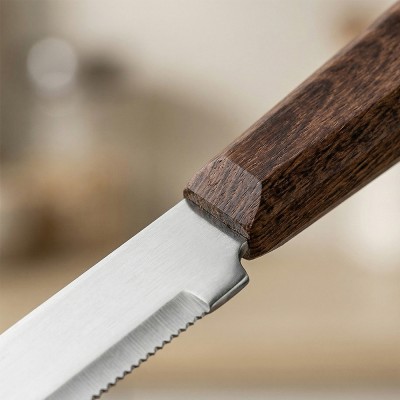 Il cuore tecnologico di questi strumenti risiede nella lama in acciaio inossidabile speciale. Con uno spessore di 0.8 mm e una seghettatura di precisione, ogni coltello garantisce un taglio netto che rispetta le fibre degli alimenti, dalle carni rosse alle verdure più delicate. La variante a punta arrotondata aggiunge una funzionalità indispensabile: la sua forma permette di spalmare burro, salse o formaggi morbidi con estrema semplicità, rendendolo un vero alleato polivalente.
