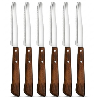 Questo set comprende 6 coltelli da tavola di alta qualità, caratterizzati da un elegante manico in legno marrone chiodato e resinato. Ogni pezzo misura 22 cm totali (lama 11 cm) ed è realizzato in robusto acciaio inox temperato AISI 420, perfetto per un uso quotidiano intensivo.Se ordinato entro le 13:00 spediremo lo stesso giorno con codice tracking del corriere e consegna entro 48 ore (se il corriere non ha intoppi).