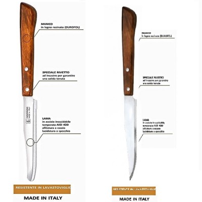 Il cuore tecnologico di questi strumenti è l'acciaio inossidabile temperato AISI 420, lucidato a specchio per una resistenza superiore alla corrosione e un'affilatura a rasoio duratura. Il manico in Durofol (legno resinato e chiodato) offre il fascino estetico del legno naturale unito alla robustezza dei materiali tecnici moderni, assicurando una presa ergonomica e la massima igiene. Grazie ai rivetti ad incastro, la struttura risulta solida e bilanciata, ideale sia per l'uso domestico quotidiano che per le sollecitazioni del settore ristorazione.