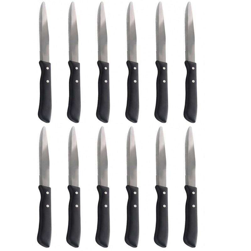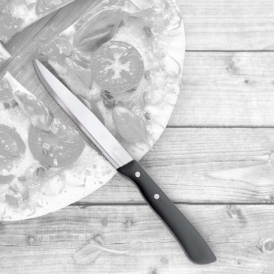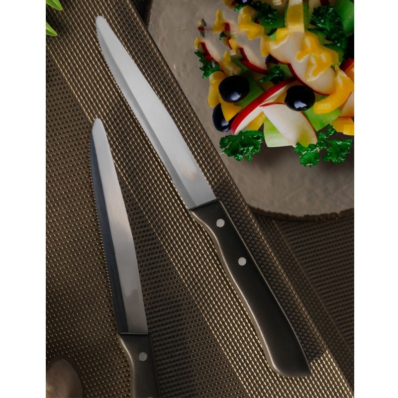 Questo raffinato set comprende 12 coltelli da bistecca caratterizzati da una lunghezza totale di 22 cm e una lama in acciaio inox da 11 cm. Il design è impreziosito da un elegante manico color mogano con texture effetto legno, realizzato in polipropilene resistente e indeformabile. Un prodotto robusto, interamente Made in Italy, ideale per unire estetica naturale e praticità d'uso.
