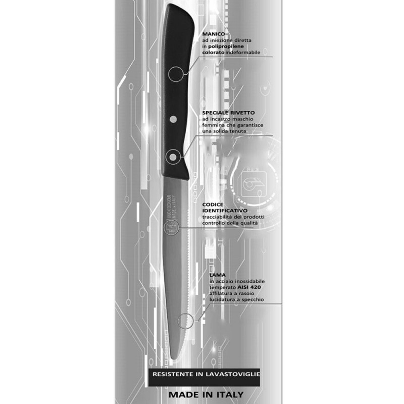 La lama seghettata è studiata specificamente per garantire un taglio perfetto e senza sforzo su carni rosse, pizze croccanti, ma anche su cibi più delicati come carni bianche, verdure e pesce. La finitura curata nei minimi dettagli e la tracciabilità garantita dal codice identificativo stampato sulla lama sono sinonimo di controllo qualità e sicurezza alimentare.