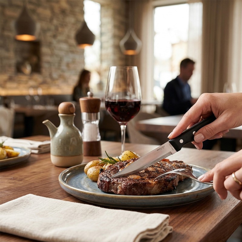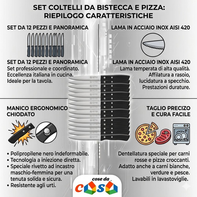 Cose da casa vi propone un set di coltelli da tavola che rappresenta l'eccellenza della manifattura italiana in cucina. Realizzati con lame in acciaio inossidabile temperato AISI 420, questi strumenti offrono un'affilatura a rasoio e una lucidatura a specchio che ne esalta l'estetica e la funzionalità.