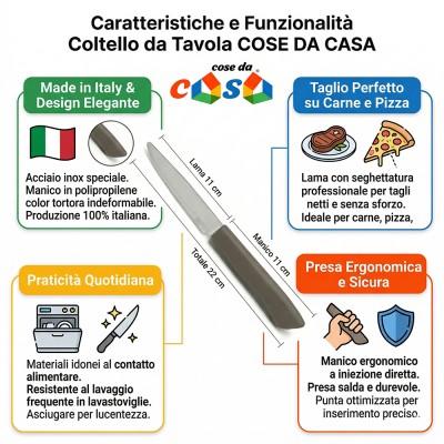 La qualità costruttiva è garantita dalla produzione Made in Italy, che si riflette nell'uso di materiali di alta gamma:Dimensione totale: 22 cm Materiale lama: acciaio inox di 11 cm -Materiale manico: polipropilene indeformabile di 11 cm il manico a iniezione diretta è realizzato in polipropilene indeformabile, un materiale che offre una presa salda, sicura e duratura. Il colore tortora conferisce un tocco di eleganza contemporanea che si adatta perfettamente a ogni tipo di apparecchiatura, dalla cucina di casa alla sala di un ristorante.