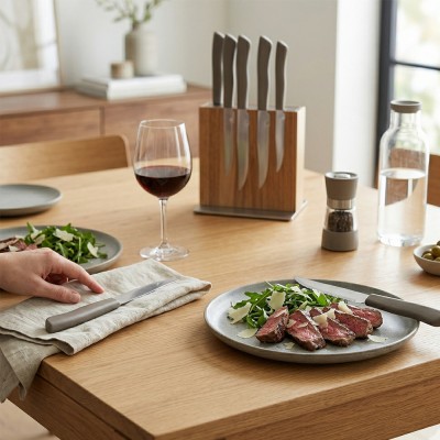 Questo set comprende 12 coltelli da tavola rifiniti in un elegante color Rovere beje con texture effetto legno realistica. Ogni pezzo misura 22 cm totali, con una lama in acciaio inox da 11 cm e un manico ergonomico in polipropilene indeformabile. Prodotti interamente in Italia, uniscono la resistenza dei materiali moderni al calore estetico del legno naturale.
