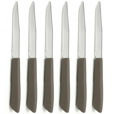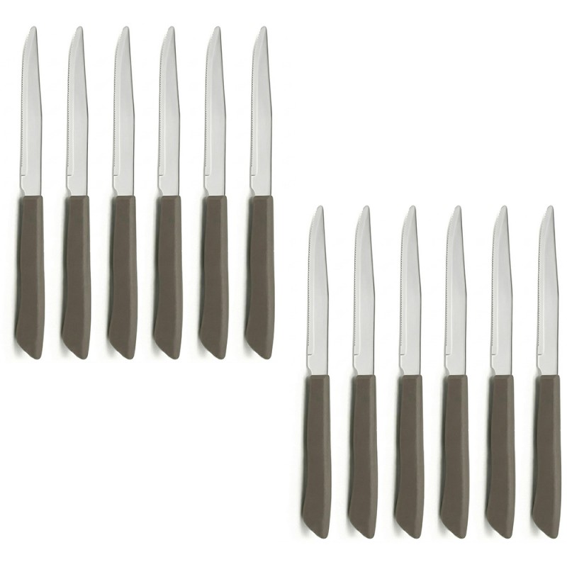 Questo set comprende 12 coltelli bistecca caratterizzati da un elegante manico color tortora e una lama in acciaio inox speciale con punta specifica per pizza e carni.