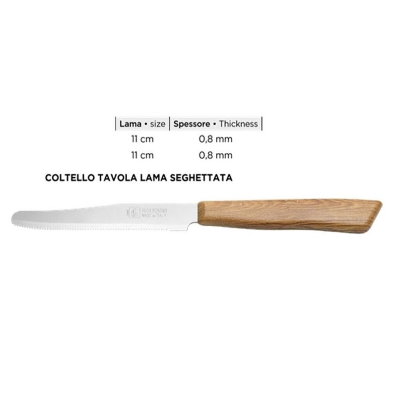 Questo raffinato set comprende 12 coltelli da bistecca caratterizzati da una lunghezza totale di 22 cm e una lama in acciaio inox da 11 cm. Il design è impreziosito da un elegante manico color Rovere con texture effetto legno, realizzato in polipropilene resistente e indeformabile. Un prodotto robusto, interamente Made in Italy, ideale per unire estetica naturale e praticità d'uso.