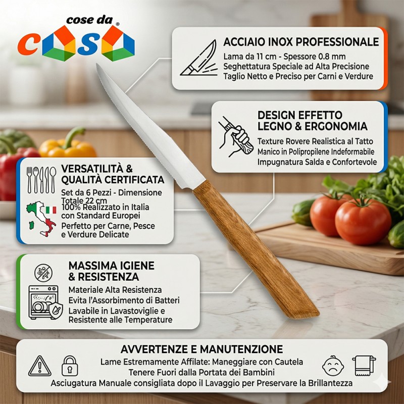 Cose da Casa vi propone soluzioni intelligenti e di stile, pensate per chi non vuole rinunciare alla bellezza nella propria quotidianità. Questo set completo da 12 pezzi include 6 coltelli a punta arrotondata e 6 a punta seghettata, ideali per carne e pizza. Realizzati in elegante marrone effetto legno naturale, misurano 22 cm totali (lama 11 cm) con lame in pregiato acciaio inox AISI 420. Se ordinato entro le 13:00 spediremo lo stesso giorno con codice tracking del corriere e consegna entro 48 ore (se il corriere non ha intoppi).